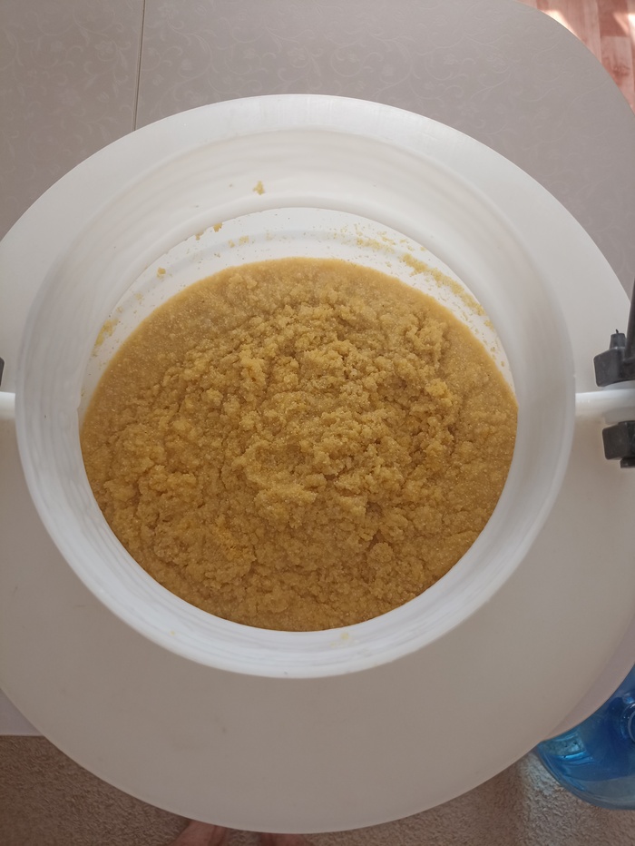 Брага отбродила за 10 дней. Настало время ее перегнать. Поскольку в моем аппарате нет фальш дна, дабы избежать пригорания я ее процедил. Скажу так, это то ещё удовольствие! Поскольку от риса там уже мало, что остаётся. То, что осталось, я отжал через марлю и ради интереса взвесил на весах. Из 10,4 кг риса осталось 2,4кг. Фото ниже прилагаются: