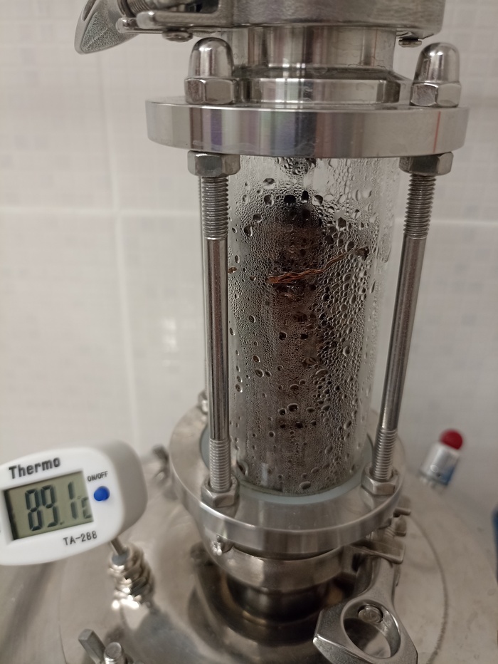 2. Отбор тела на 1,6 кв (моей плитки). Скорость не мерил, ни чего не отличалось от сахарной. Читал, что нужно полностью перекрыть подачу воды на дефлегматор, попробовал, не очень-то понравилось. При температуре в кубе около 94грС, из выходной трубки начала вырываться вода с паром, побоялся, что сорвет быстросъём, добавил немного в подачу холодной.
