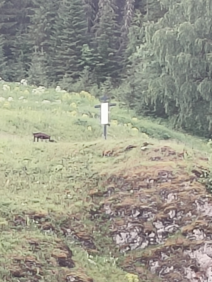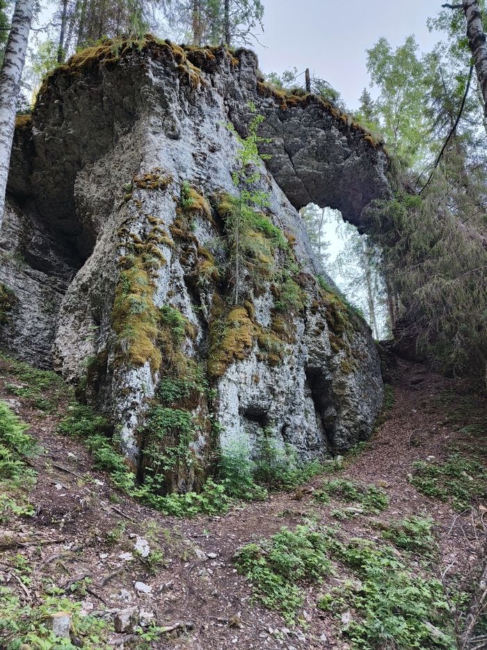 Под камнем находится оборудованная стоянка с небольшим столом под навесом, расположенная на заросшей травой полянке. По берегу до нее идет неплохо накатанная дорога через лес. От реки полянка находилась довольно далеко, так что пришлось потратить некоторое время на то, чтобы перетаскать туда всю нашу поклажу. Поставив лагерь, мы отправились на камень.