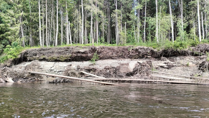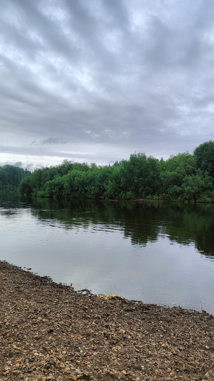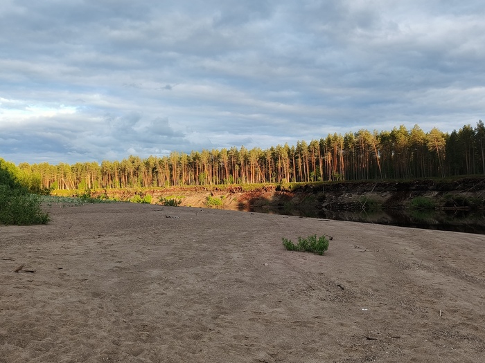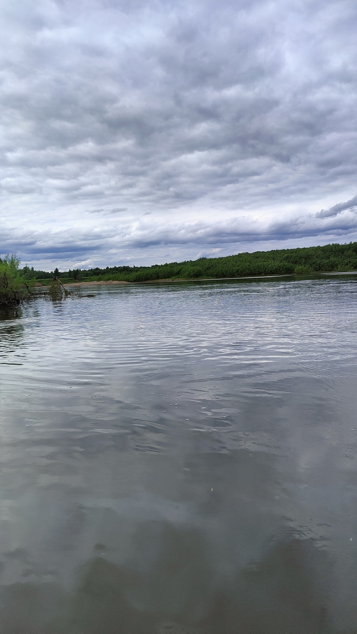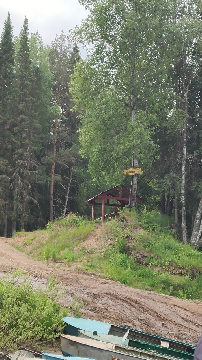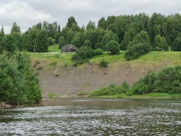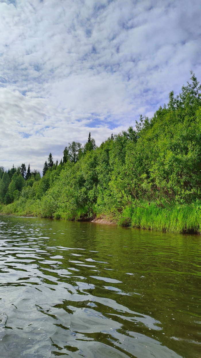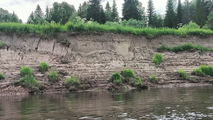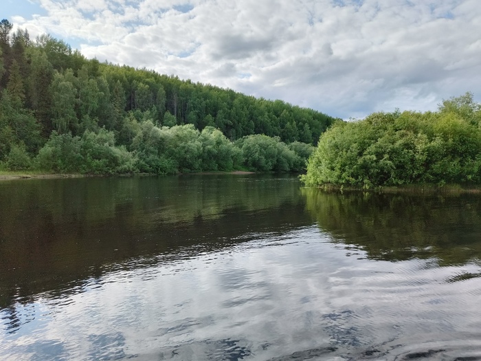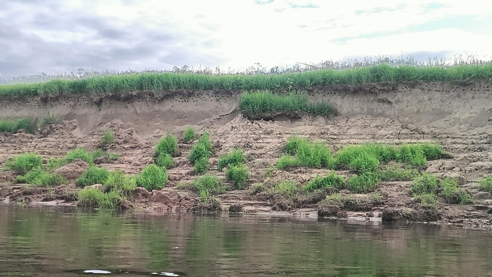Ночью прошел небольшой дождик, и с утра небо было затянуто облаками. Впереди нас ждал небольшой переход по реке и долгий путь домой из Ныроба, поэтому мы не стали тянуть время и в половине девятого были уже на воде. Прощаясь с рекой, мы дружно работали веслами, выгребая против ставшего уже привычным ветра. Река в этих местах широкая и глубокая, течение совсем слабое. На берегах стали попадаться стоянки, встречались обрывы с норами ласточек. На излучине реки мы дошли до поселка Вижаиха. На берегу стояли лодки, в некоторых из них копошились рыбаки.