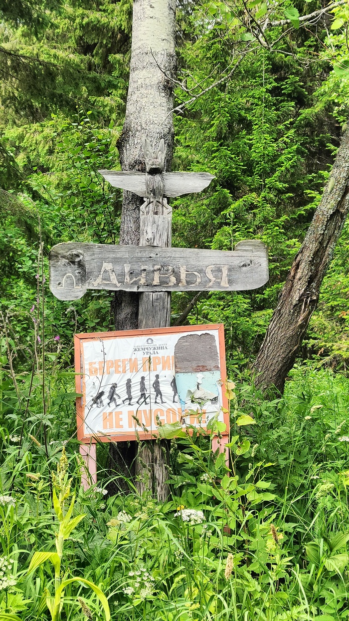 По карте рядом располагалась Дивья пещера, и мы внимательно высматривали начало тропы к ней. Вскоре нам встретился мосток, около которого мы пристали к берегу. Наверху была небольшая стоянка с костровищем и табличка с названием пещеры, в лес уходила искомая тропа, которая оказалась настоящим испытанием для нас.