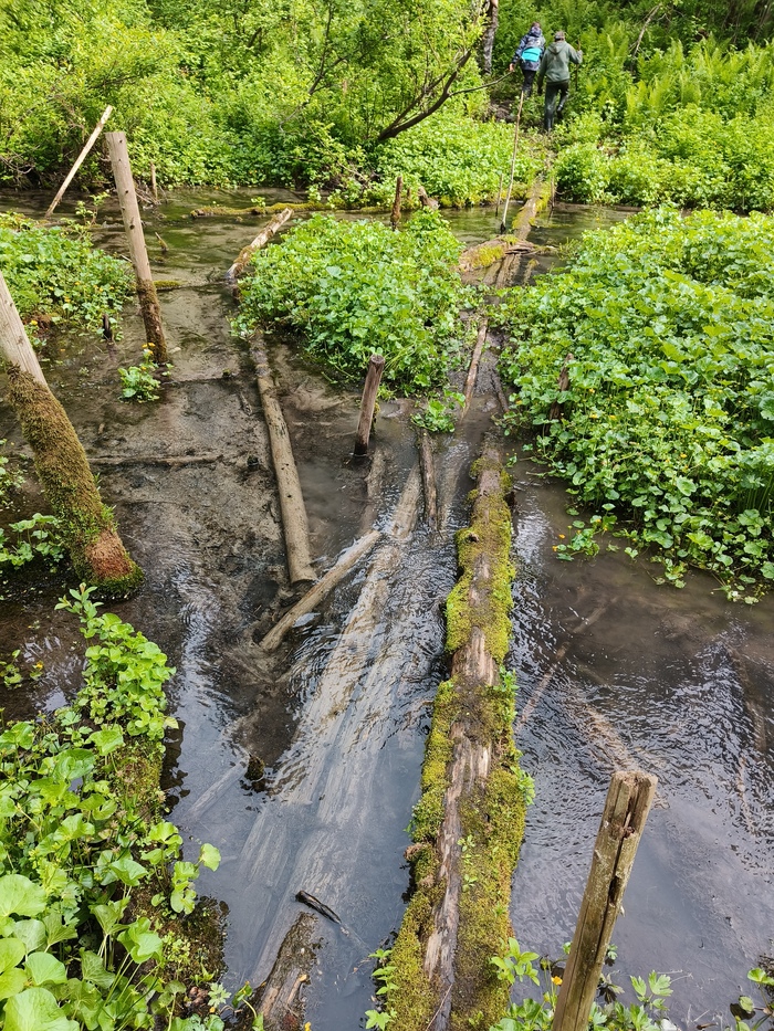 Немного углубившись в лес, мы обнаружили первый сюрприз для тех, кто шел в кроссовках. Тропа пересекала небольшую речку по скользким узким бревнам, находящимся немного ниже уровня воды. Для поддержания равновесия в дно было воткнуто лишь несколько палок, так что пройти, не упав в реку оказалось очень непросто.