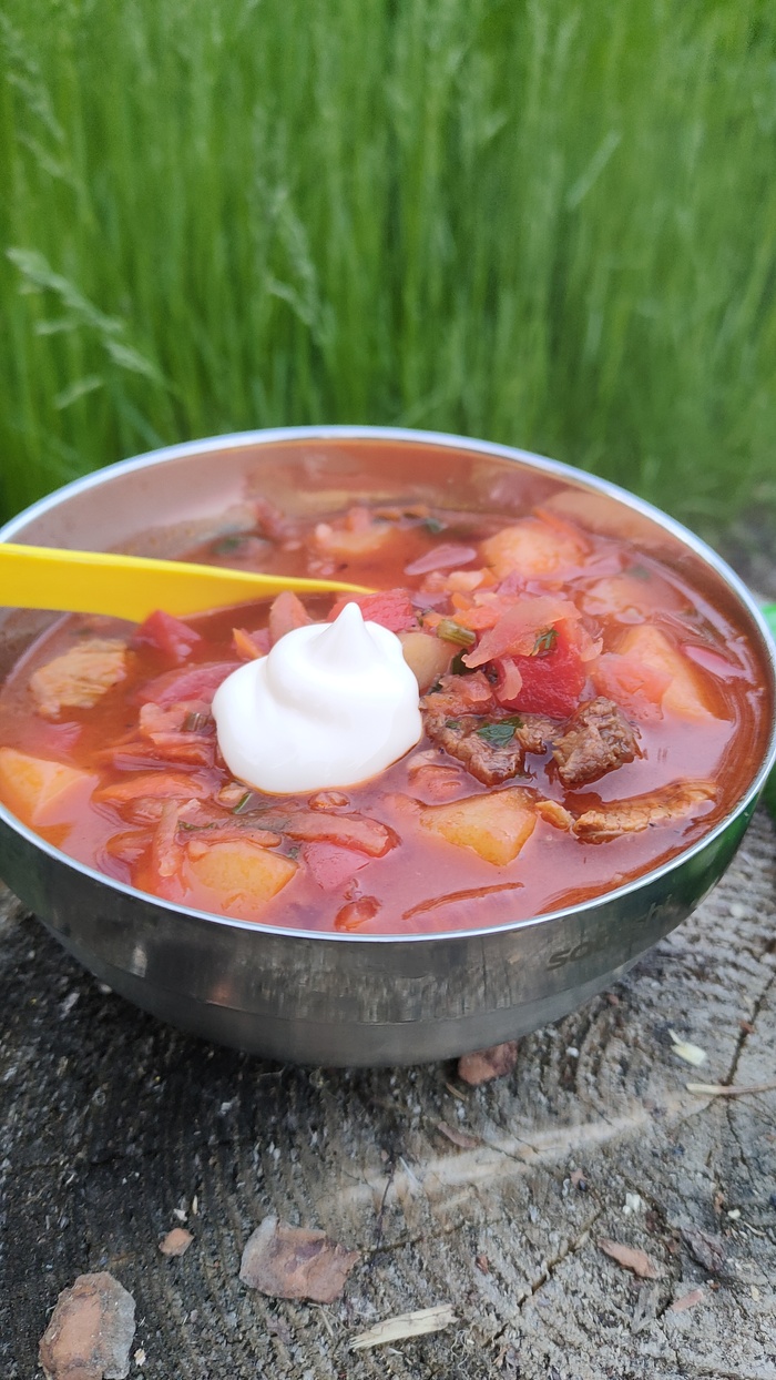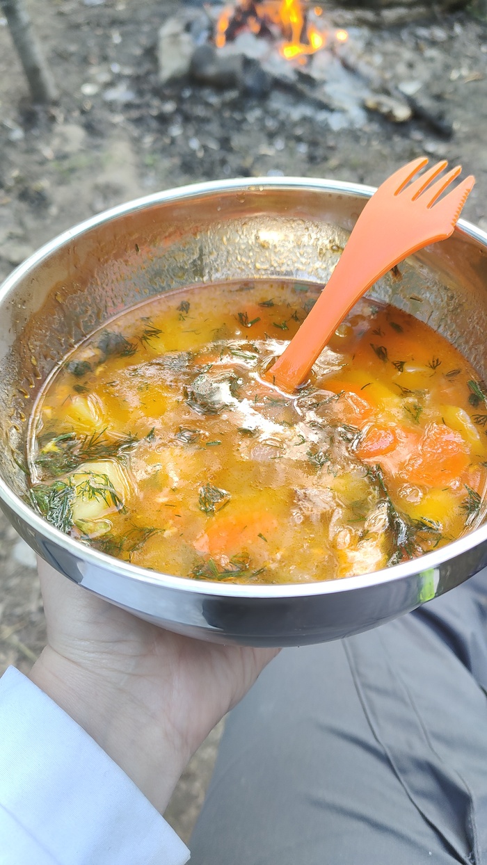 Пока наши спелеологи покоряли просторы пещеры, мы отправились в обратный путь к берегу. Спускаться было конечно легче, чем подниматься, но легкой прогулкой по лесу этот путь точно не назвать. Окончательно промочив ноги в речке, мы вернулись на стоянку, где уже был практически готов суп. Аппетит после такой прогулки разгулялся не шуточный. Примерно через час вернулись наши грязные с головы до ног, но очень довольные вылазкой исследователи пещеры, и вскоре мы продолжили свой путь по реке.