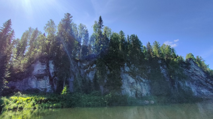 Гребец на лодке уже не мог вытянуть в одиночку всю нашу кампанию, так что пришлось дружно браться за весла. Поработав ими около часа, мы дошли до следующей интересной точки нашего маршрута, камня Ветлан. Он похож на своего тезку с Вишеры, но намного короче.