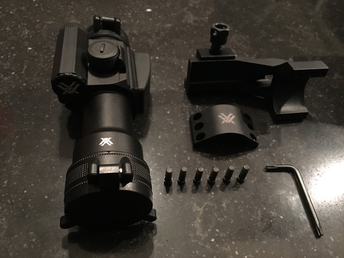 Коробка и е содержание. Видно, что прицел никогда не устанавливали— отсутствуют потёртости и микроцарапины. Болты крепления тоже без следов использования— короче просто открыли коробку и по какой то причине решили им не пользоваться