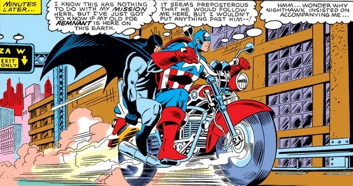 Значит, пора перейти к комиксу Captain America #314 за февраль 1986 года. И начинается комикс...с Бэтмэна? Ну, не совсем. На Земле-712 Найтхоук (“Бэтмэн”) просит помощи у Профессора Имама. Тот отказывается помочь лично, но телепортирует Найтхоука на Землю-616, в основную вселенную Марвел. Авось там ему помогут. Появляется Найтхоук в зале, где тренируется Капитан Америка, сразу выхватывает по лицу и начинает оправдываться, что ващет пришёл с миром. “Ну и что тебе нужно? – Хотел попросить у Мстителей помощи, надо устранить мою бывшую команду, Верховный Эскадрон”. Найтхоук объясняет – его Землю изрядно потрепали инопланетные вторжения, и Эскадрон (“Лига Справедливости”) взялся поднять Землю с колен...и переборщил. Потому что Гиперион (“Супермэн”) предложил превратить Землю в Утопию...для чего Эскадрон взял всю планету под свой контроль. Начали с раздачи еды голодающим, продолжили разоружением граждан и армий, а также начали промывать мозги преступникам, устраняя способность совершать преступления и свободу воли. Капитан Америка созывает экстренное собрание Мстителей. “Поможем?”. Не помогут. “Проблемы других вселенных не касаются Мстителей, пока они не касаются Земли, и в особенности проблемы политического строя, мы сражаемся с суперзлодеями, а не правящим режимом”.