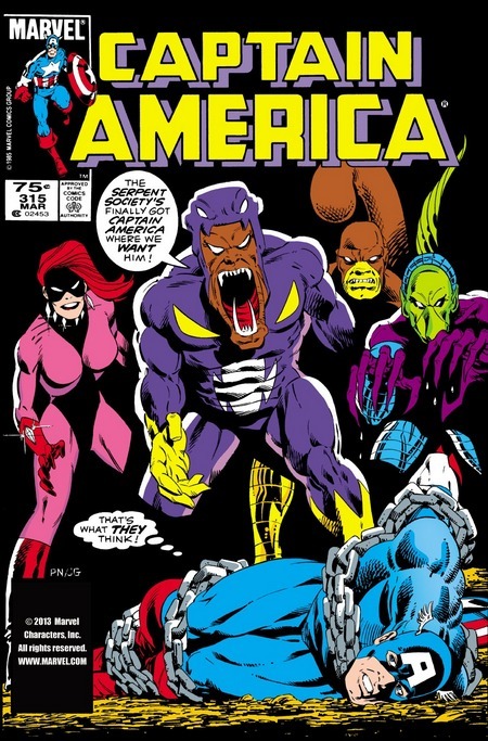 А я перехожу к комиксу Captain America #315. Змеи, которых Сайдвайндер освободил из “обезьянника”, похищают из морга тело Модока (чтобы был пруф выполнения миссии) и доставляют на базу АИМ, где получают за него денюшку. Там же Змеи сталкиваются с Александром Джентри, Дикобразом – тот всё ищет, кому бы свой колючий костюм продать, ибо решил завязать с суперзлодейством и деньги нужны. А Принцесса Питон просыпается в Змеином логове, прикованная к пыточному устройству, Сайдвайндер её наказывает за предательство и не слушает отговорки. Когда возвращаются с добычей остальные Змеи, начинается делёжка. А Дикобраз в своей задрипанной квартирке тоскует – никому его костюм не нужен даже по урезанной цене. А Капитан Америка получает срочный звонок по горячей линии и отчаливает как раз когда Берни Розенталь собиралась с ним серьёзно поговорить. И развесёлой девахе становится тоскливо, потому что время Стива равномерно поделено между работой художника и супергероя, а ей уделяется самый минимум. А звонил, оказывается, Джентри, он хочет продать свой костюм Мстителям, и в процессе упоминает, что у него есть телефон Змеиного Сообщества. Вот эта деталь интригует Кэпа, и он предлагает план.