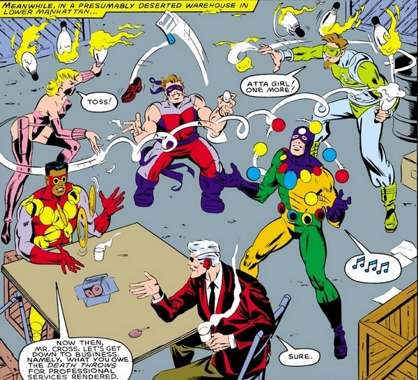 Кстати, о Соколином Глазе. Впереди же комикс Captain America #317. Соколиный Глаз и Пересмешница должны дать показания на суде над наёмником Кроссфайром – но Кроссфайра спасают другие наёмники и он уезжает с ними, а толпу зрителей и полицейских наёмники забрасывают дымовыми бомбами. А Стив Роджерс и не в курсе, он помогает Берни Розенталь с переездом. Её батя доволен, что Берни наконец-то перестанет встречаться с гоем. А далеко оттуда на заброшенном складе тусуется группа преступников “Смертебросы” (Death Throws, буквально Смертельные Броски, но созвучно с Death Throes, “Предсмертная агония”), участники которой спасли Кроссфайра. Смертебросы выдвигают Кроссфайру внушительный счёт, а тот оправдывается, мол, денег нет, но вы держитесь. Наёмникам это не нравится, и они запугивают Кроссфайра своими талантами (они все поголовно жонглёры), а затем думают, с кого бы стряхнуть за него выкуп.