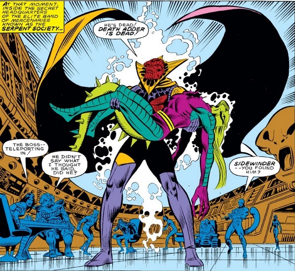 И вот, у Сайдвайндера звонит телефон. “Кто говорит? – Слон! То есть, Дикобраз! Я Кэпу по шапке выписал, но чот стремаюсь его убивать, может, он вам ползучим нужен?”. Капитан заставил Джентри надеть его колючий костюм в последний раз. “Кэп, а мне точно не придётся сражаться? – Точно-точно. Сдай меня змеям, а дальше я сам всё порешаю”. План приводят в исполнение, и забирать Капитана приходят Гремучник, Смертегром, Щитоморд и Даймондбэк. Увы, они не собираются доставлять Кэпа на базу, а намерены убить его на месте. Ну, только Даймондбэк против, Кэп же красавчик. Но убийства не будет – Капитан подскакивает и начинается махач. Дикобраз решает потихоньку сбежать, и Даймондбэк пускается за ним в погоню (это ещё и отмазка чтобы не бить Кэпа). Разобравшись со Змеями, Кэп понимает, что одной не хватает, и бежит её искать. А находит умирающего Дикобраза. “Это та Змея тебя так отделала? – Нет...это я сам. Споткнулся, упал на одну из собственных игл. – Ща скорую вызову. – Можешь не торопиться. Игла в сердце, я уже не жилец. Умру, как и жил, неудачником”. И таки умирает. И таки насовсем. А Кэп сдаёт Щитоморда, Гремучника и Смертегрома в полицию и остаётся дежурить, чтобы понять, как Змеям удаётся каждый раз сбегать. И прямо при нём появляется Сайдвайндер. “Привет, Капитан. Можешь уходить. Ты же не собираешься тут поселиться, рано или поздно свалишь, тут-то я своих подчинённых и эвакуирую”. Мда...