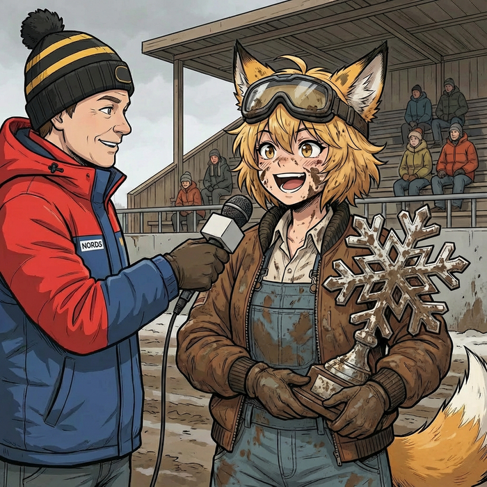 Иии, проявив невероятные морально-волевые, Роберта - некогда желтая лиса, а теперь вот серо-бурая - эффективно маскируясь под окружающую местность, штурмует финишную черту! Победа!