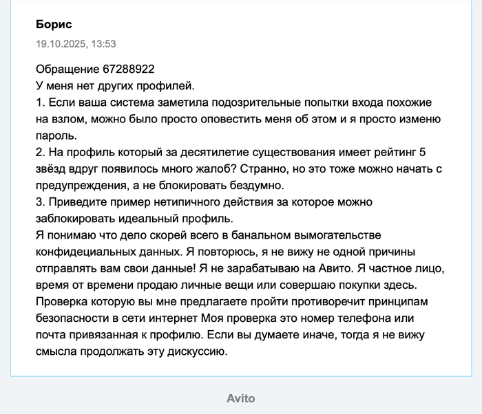 Больше десятка лет я являлся честным продавцом и покупателем на Авито. За это время у меня сформировался идеальный профиль без единой четвёрки, строго пять звёзд. Я никогда не использовал платформу для заработка, просто продавал то, что мне уже не было нужно. Старался делать качественные фотографии, всегда правдивое описание. Несколько раз платил за объявления так как этого требовали правила платформы.