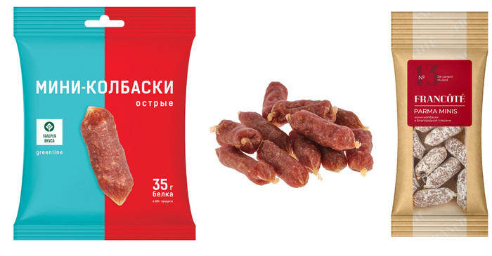 Маленькие колбаски длиной около 2 см и диметром 8-10 мм. Подсушенные. Есть как обычные, так и с благородной плесенью в стиле фуэт (Parma Minis). Могут подойти не только под пиво, но и отлично сочетаются с бокалом вина.