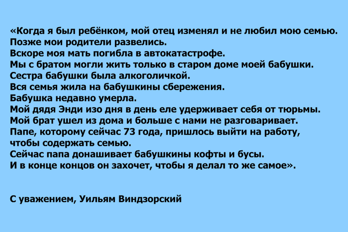 Самое печальное в этой истории то, как общается современная королевская семья. Отец и сын не могут просто поднять трубку и поговорить. Все переговоры идут через помощников, секретарей, пресс-секретарей.