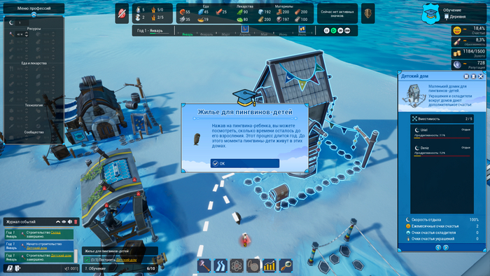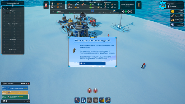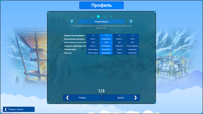 Геймплей строится на следующем: вначале дают парочку пингвинов взрослых и детей, и небольшие ресурсы. Хотя, если начать новую игру, то есть возможность самим выбрать уровень сложности и другие параметры.