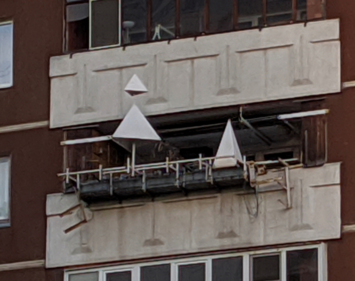Как то шел по городу, заметил это чудо инженерной мысли. Судя по масштабу, этот металлический каркас выглядит сбоку чуть ли ни как пеленгатор радиосигналов и возможно либо в дальнейшем либо раньше здесь стояло больше пирамидальных пеленгаторов). Потому что слева свисает часть конструкции. Ну и соответственно кроме как предположить что это устройства для выкачивания космической энергии увы и нет...)