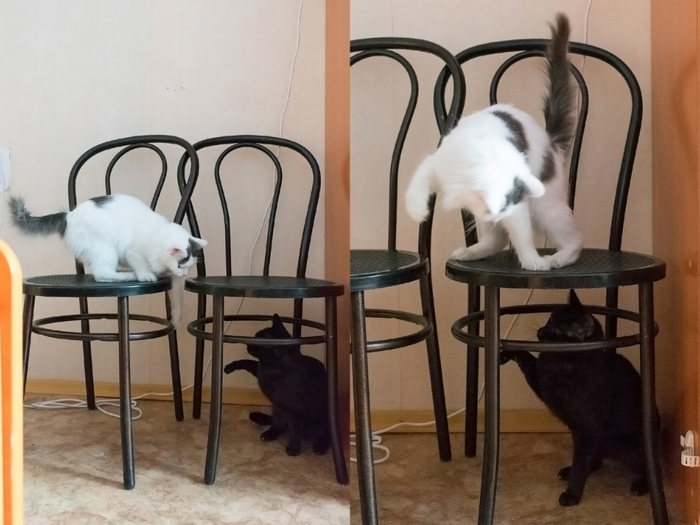 Еще одна игра, которую придумала Циска - охота под дверью. Играют с ней оба кота, но чаще Флешка. Участники ложатся по обе стороны закрытой двери, просовывают в щелочку лапы и носы и пытаются поймать соперника. Пошло это с тех времен, когда Циска скучала на карантине в отдельной комнате, но игра не теряет своей популярности до сих пор (дверь обычно закрываем по вечерам, когда дочь ложится спать - чтобы меньше звуков из нашей комнаты доносилось).