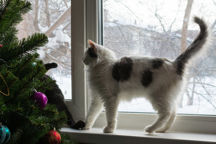 В итоге у Циски и Пикселя если не возникла привязанность, то, по крайней мере, уже нейтралитет. Они даже на одной кровати могут валяться в дипломатичном метре друг от друга. К счастью, жевать ёлку Циске не нравится - видимо, она не разменивается на заведомо несъедобные вещи.