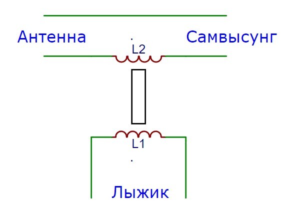 Через первую обмотку включил Самвысунг, в смысле - резистор, который изображал из себя нагрузку, через вторую - свой телевизор, который изображал из себя Лыжика.