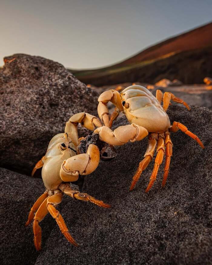 Два желтых сухопутных краба (Johngarthia lagostoma) схватились за только что вылупившуюся зеленую черепаху.