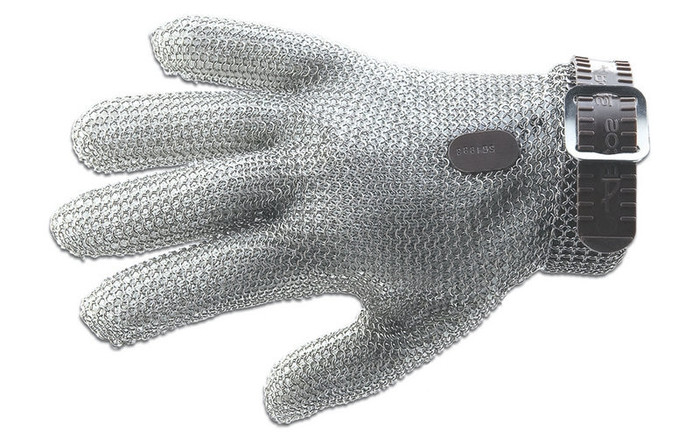 Кольчужные перчатки из нержавеющей стали используются в пищевой промышленности теми, кто постоянно работает с ножами, например на разделке мяса. Надеваете на руку и случайно отрезать кончик пальца не получится. Это специфический вид защиты для конкретной работы - такая перчатка защищает только от порезов, но это не помешает ее проколоть или раздробить кости топориком. Еще одно специфическое требование - перчатка выдерживает агрессивные моющие средства, которые используют для отмывки в промышленности. И это единственный тип перчаток, которые продаются поштучно, поскольку надевается она только на одну руку.