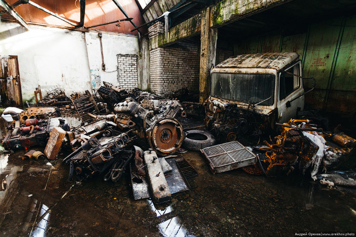 Остатки гаража. На улице целая стоянка заброшенной техники.