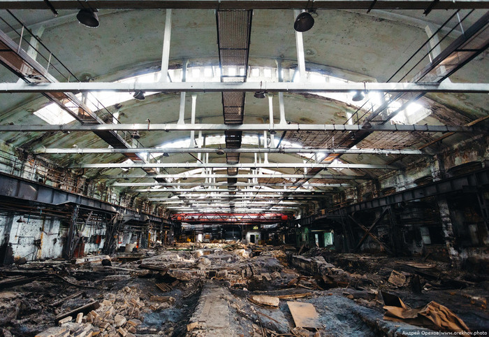 Один из первых цехов завода. Весь разобран, остался один каркас.
