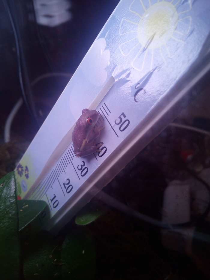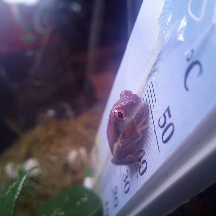 А еще у Джони есть одна особенность которую недавно заметили, лягушонок может кардинально менять окраску от светло салатового до темно бордового цвета. Утром и днем малыш светло зелененький, но с наступлением темноты малыш начинает становится темно зеленным. А когда два дня не было света в террариуме он стал темно бордовым.