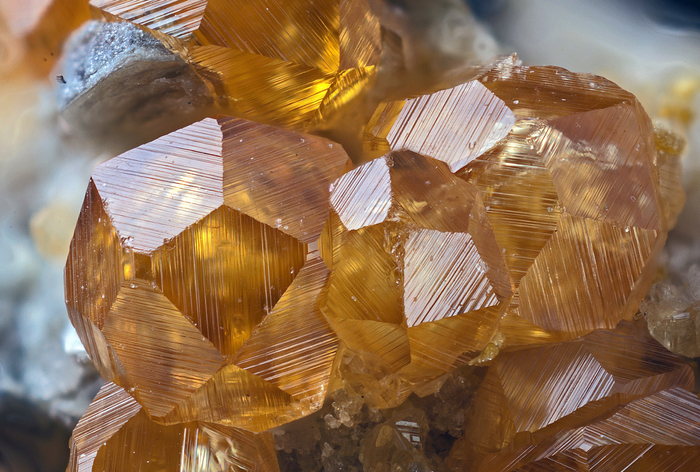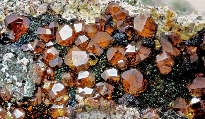 Оранжевый - андрадит-колофонит, гроссуляр-сукцинит или спессартин-мандарин