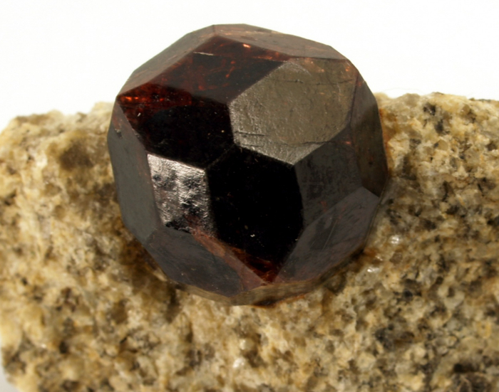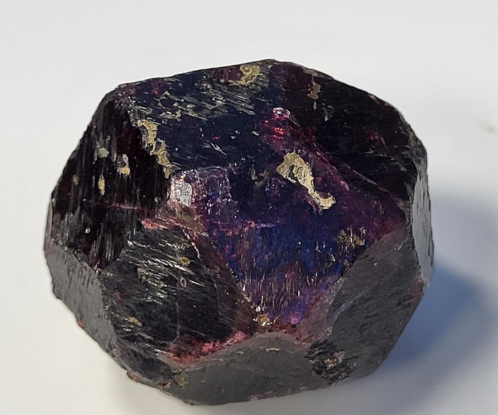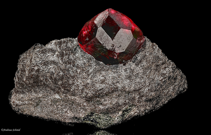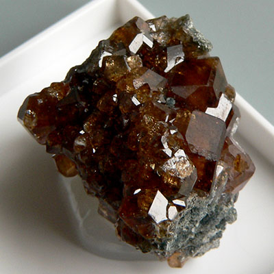 Наоборот, один из самых простых гранатов — как по стоимости, так и по широте гаммы. Самый распространённый среди них — встречается по всему свету. Ранее назывался карбункул («уголёк»), и это во многом описывает его цвет: очень тёмный; в тонких сколах, на краях кристаллов (или при правильной огранке) просвечивает тёмно‑красным, фиолетово‑пурпурным, коричневым. Ценится коллекционерами за красиво сформированные тёмные кристаллы на светлой сланцевой породе.