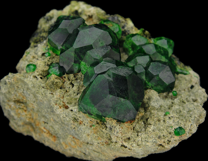 Самый простой в плане разнообразия цветов гранат: бывает только зелёным, немного разных оттенков. Причина — очень сильный элемент‑хроматофор (ион химического элемента, придающий характерную окраску): Cr³⁺. В отличие от остальных членов «большой шестёрки», практически не используется в ювелирном деле, так как не образует достаточно крупных кристаллов.