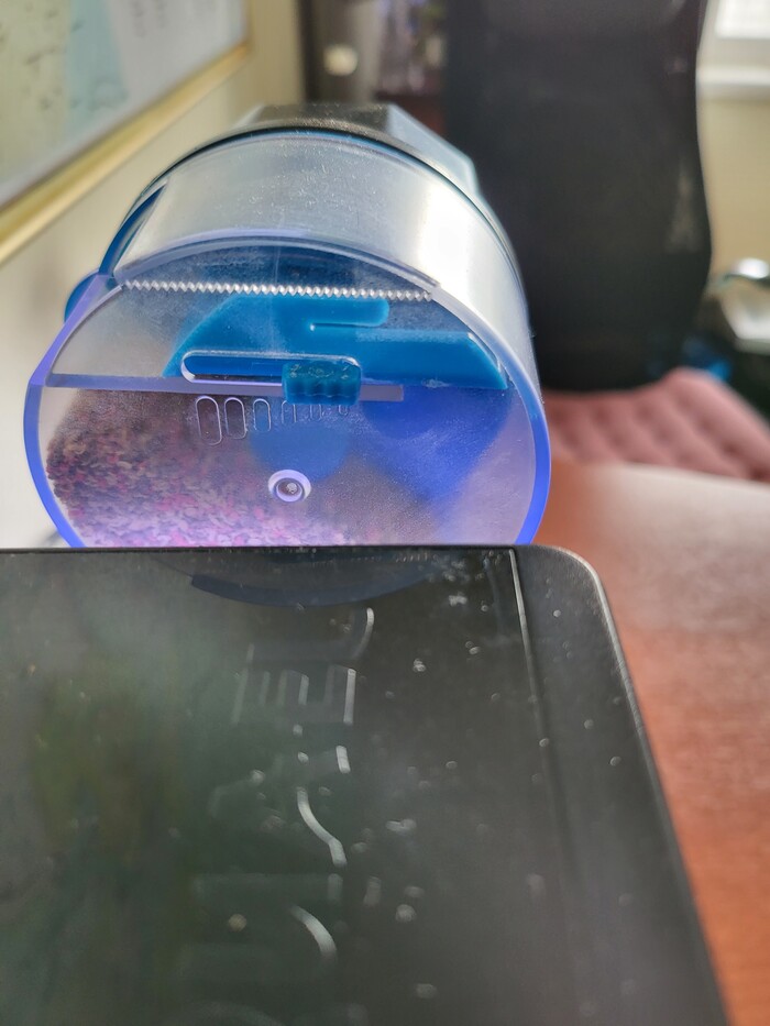 Кормушка: автоматический фидер, настроен на минимальный объём порции: