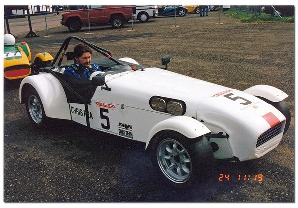 Начало 1990-х. Визит Криса (в рекламных целях) на завод и в автосалон британской компании Caterham Cars (изготавливающей современные копии знаменитого Lotus 7)