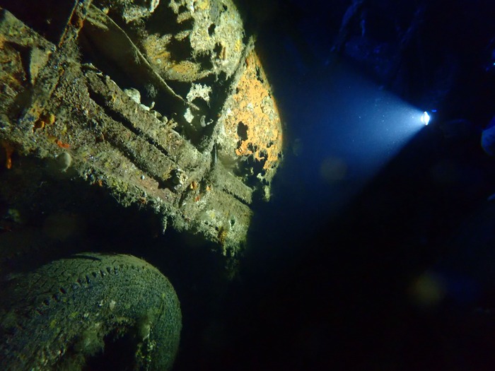 Надо сказать, рэк этот тяжеловат для среднего дайвера: довольно глубоко (приходится спускаться-подниматься в синьке), много надголовки, местами довольно узкие проходы, где без хорошей плавучести никак. Плюс в трюмах, при температуре воды снаружи в 22 градуса, было всего 18 (конец Апреля всё-таки, не самое жаркое время).
