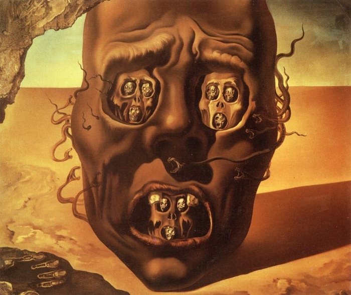 В ее глазницах множество лиц, в которых нет глаз, вместо них на нас смотрят иссохшиеся посмертные маски. Отпечаток ладони в нижнем правом углу картины - автограф самого Дали, который находится в бесконечной пустыне скорби вместе с остальными жертвами.