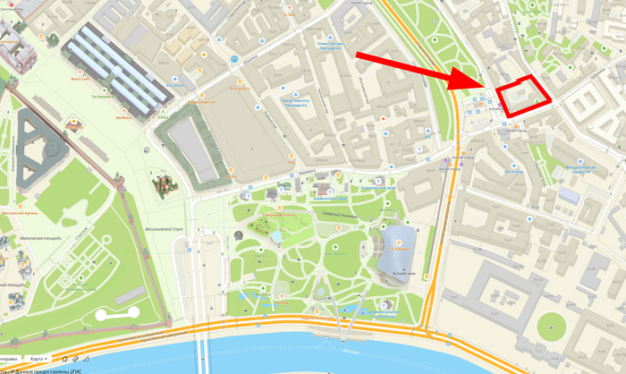 На схеме красным цветом отмечен - "самострой", там на 2ом подземном этаже элитный стрелковый клуб. Голубым историческая застройка.