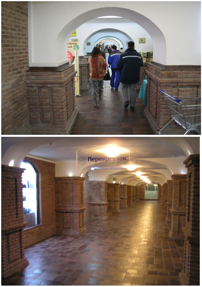 Всю эту красоту из клинкерного кирпича мы сломали опустили пол и сделали там головной офис банка. Всё отделали натуральным мрамором дорого- богато.