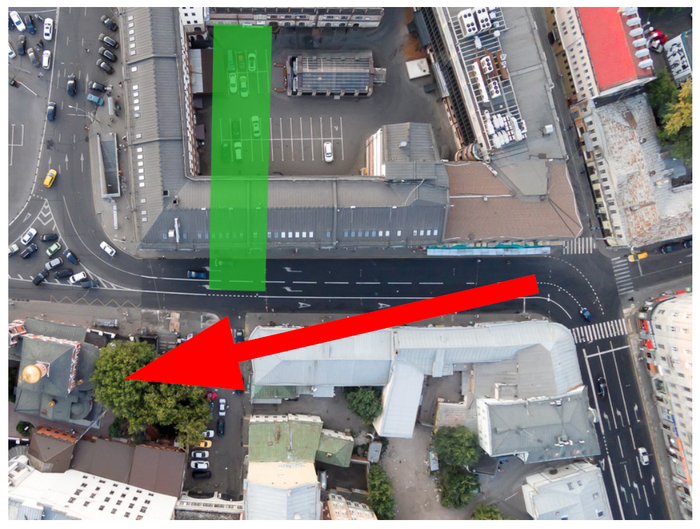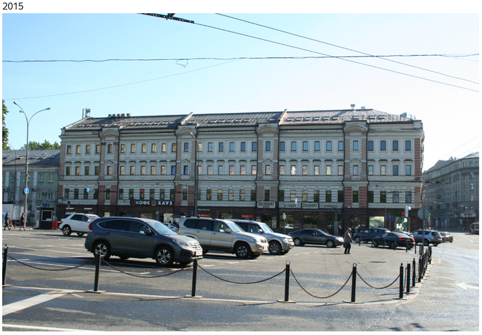 До того как там появилось кирпичное сооружение - Многоквартирный жилой дом 1888 года постройки, там было 2х этажное здание, и если совместить место его расположения с существующей ситуацией то получается :