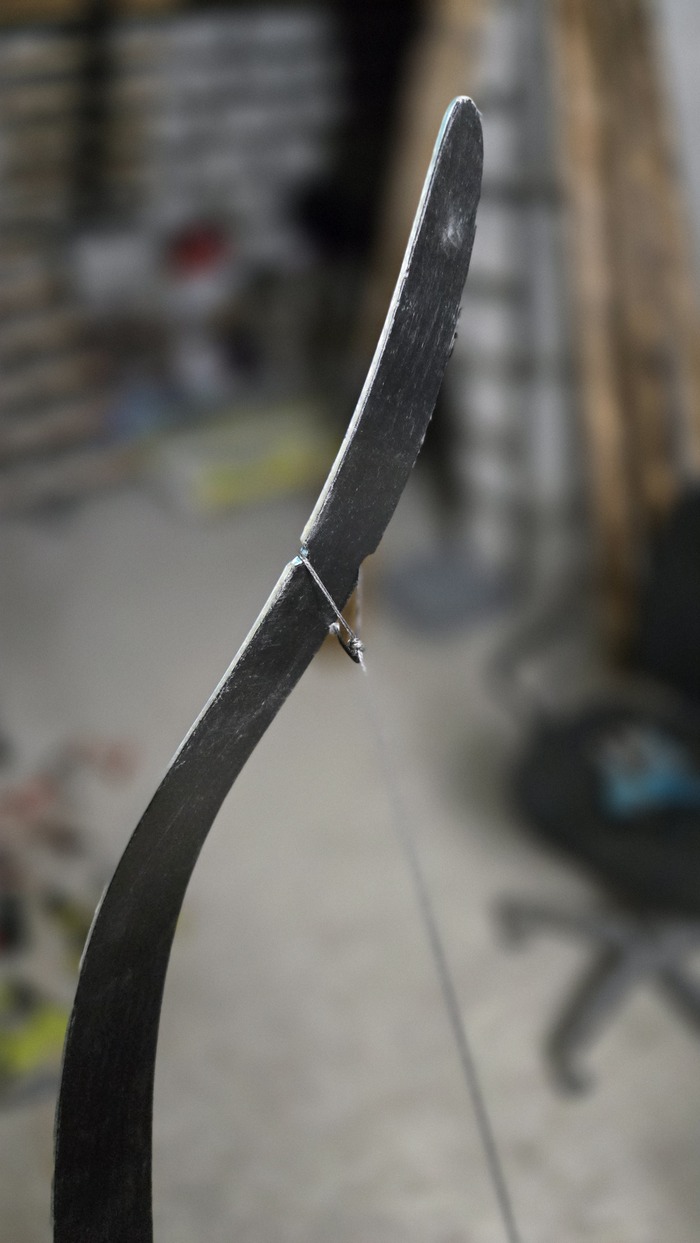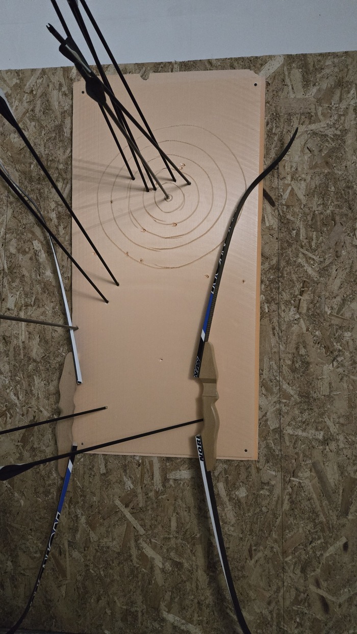 А сегодня это все добро мы с сыном распаковали. Напилили, насверлили, собрали в единое целое. В качестве тетивы использовался рыболовный шнур 1,2мм. В качестве мишени - осп с прикрученным к ней листом эппс. Дистанция - 8 метров.