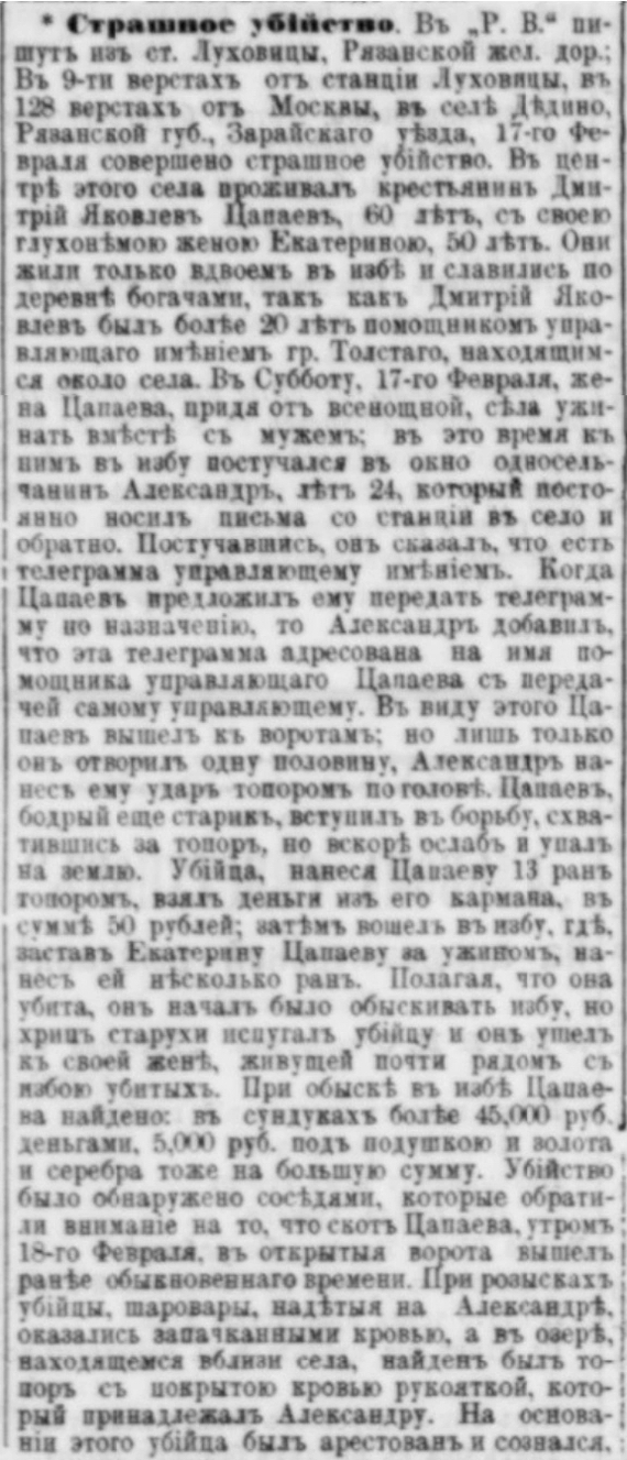 Убийца, некто Александр двадцати четырех лет, занимавшийся доставкой писем со станции Луховицы в село, под предлогом получения телеграммы, вошел в дом супругов Цапаевых, которых зарубил топором. Цапаев, как сказано в заметке "бодрый еще старик" шестидесяти лет, отработал более двадцати лет помощником управляющего имением графа Толстого, слыл на селе богачом. Именно с целью ограбления и было совершено это убийство. Преступник, довольствовался всего лишь 50-ю рублями, найденными в кармане убитого, в товремя, как в доме Цапаевых была впоследствии найдена действительно солидная по тем временам сумма в 50000 рублей, не считая других ценностей.