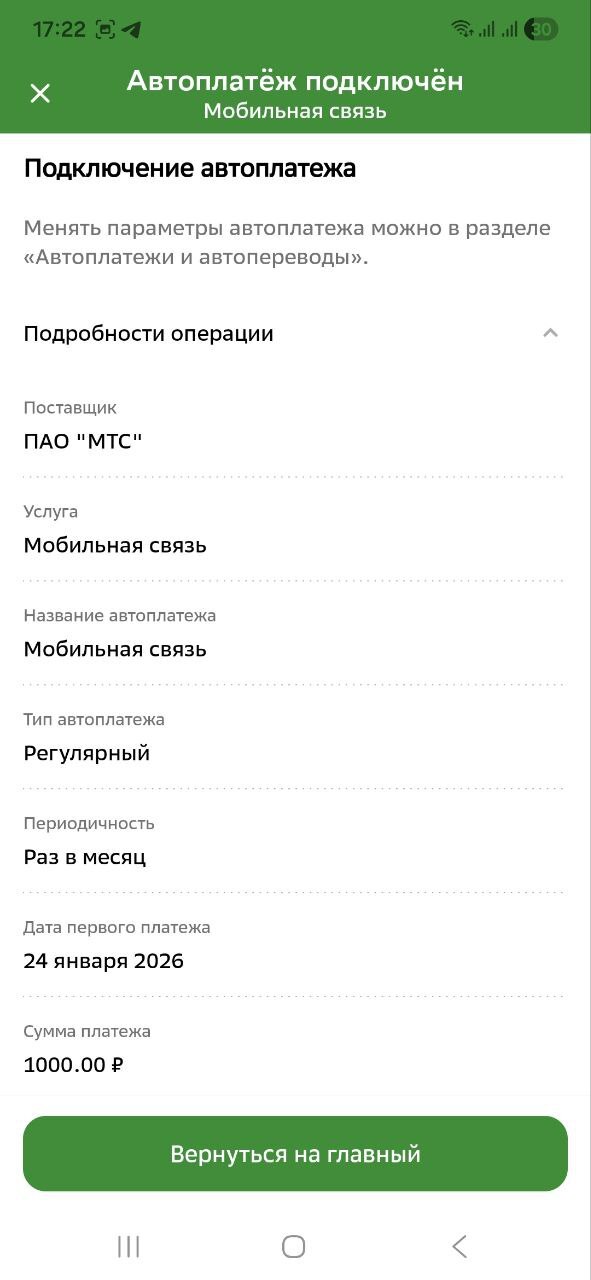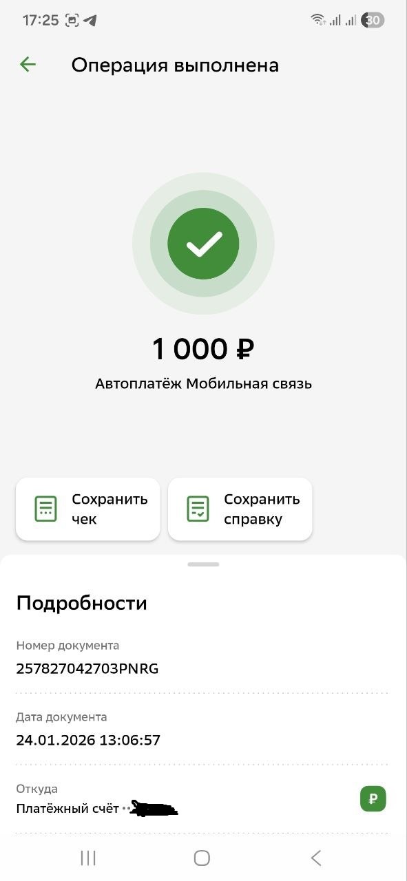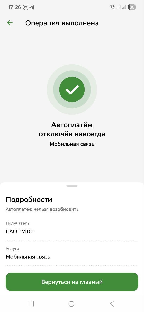 Ситуация кратко. Поздно вечером Сбер подключил автоплатеж мобильной связи, по автоплатежу оплатил 1000р. третьему лицу и тут же отключил автоплатеж. На все операции ушло 2 минуты. А теперь развернуто: