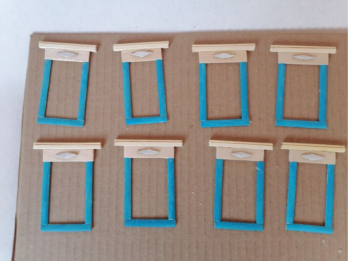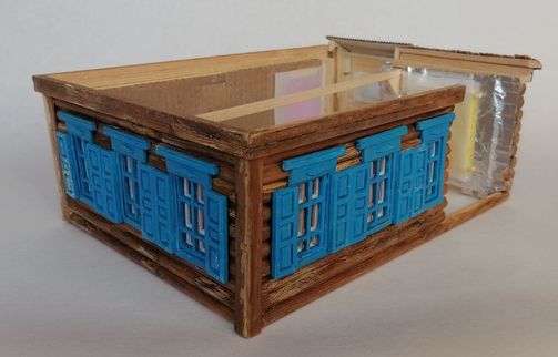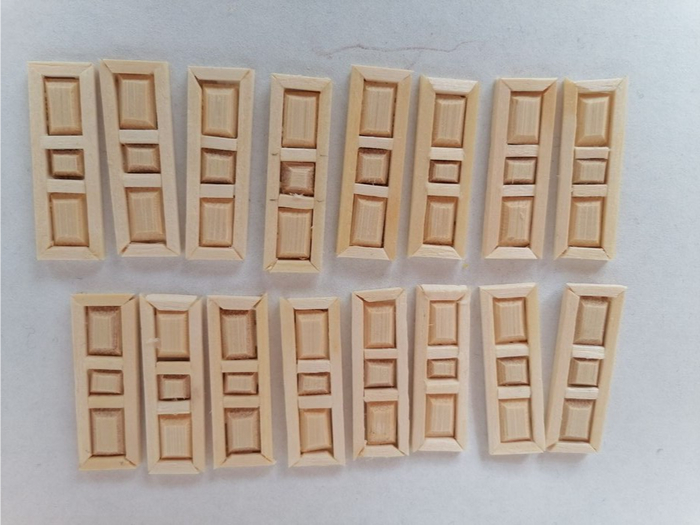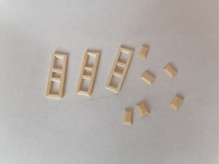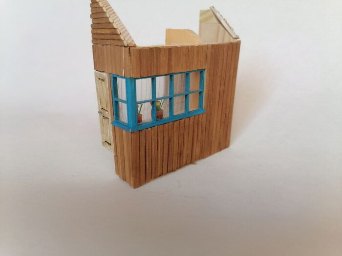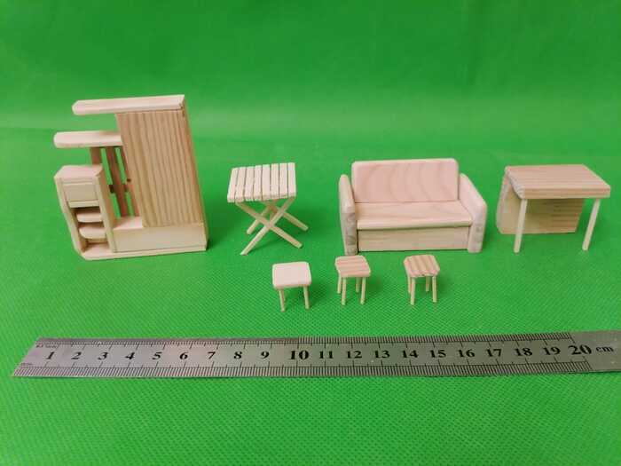 Далее еду в магазин и закупаю необходимый материал, как правило это сосновая древесина и акриловые краски. Затем приступаю к созданию чертежа и выпиливанию деталей (части стен и крыши, а также окна, наличники и детали интерьера – цветы, шкафы, стулья и столы). Тщательно вымеряю необходимые проемы в стенах для окон и дверей.
