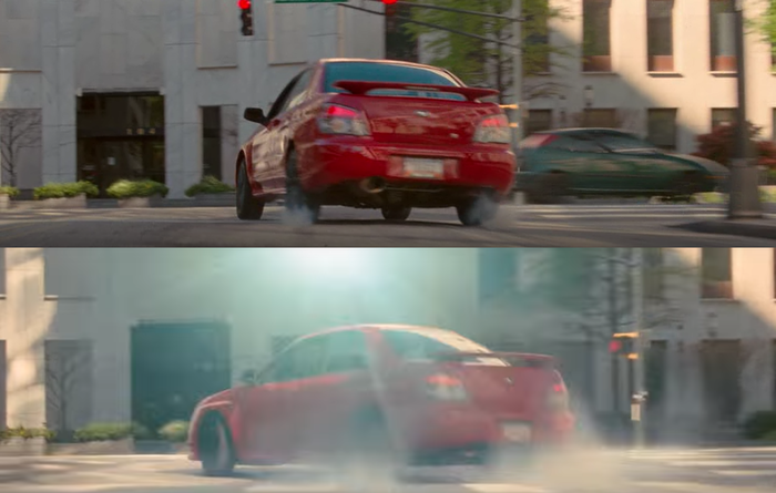 В сцене где Малыш проезжает на красный по перекрестку, можно увидеть вспышку камеры.