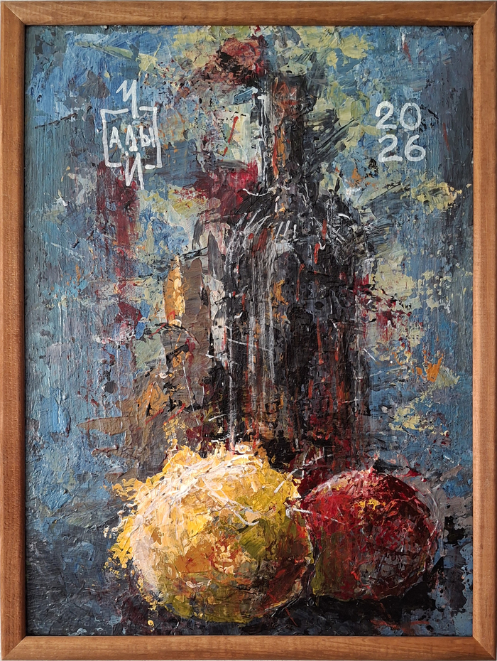 1. Сюжет: Классический натюрморт. В центре композиции находится темная, почти черная бутылка. На переднем плане расположены два фрукта: один крупный, ярко-желтый (похож на лимон, айву или крупное яблоко) и второй поменьше, красно-коричневого цвета (возможно, яблоко или гранат).