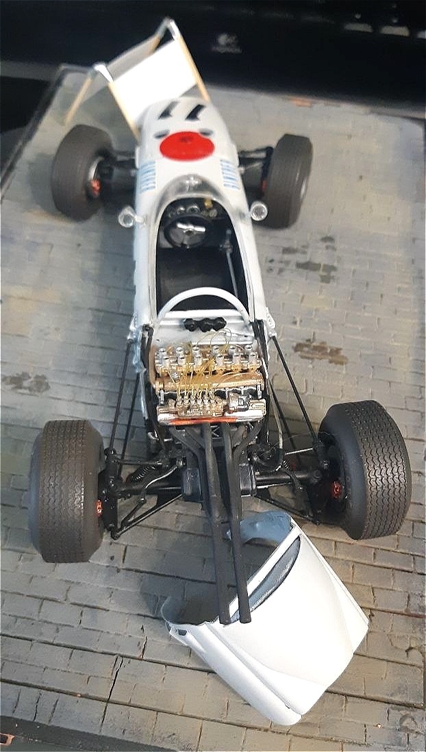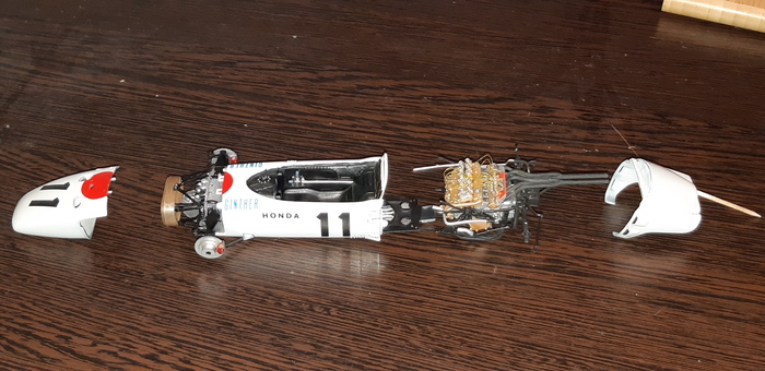 Тонкие полосы тоже легли довольно коряво. На первом фото отчетливо видно, что я неправильно разграничил белый и синий - полоса синего на горизонтальной поверхности обтекателя должна быть шире, доходить до золотого цвета. В общем это однозначно нужно переделывать, заново красить, и декали переклеивать. Декали заказал, около месяца на изготовление и доставку с Японии. Сами детали кузова разберу, сниму место пилота (оно сейчас уже вклеено на законное место), и в отмывку. Ну и все заново - склеить, зашкурить, зашпатлевать, грунт, краска, декали, лак.