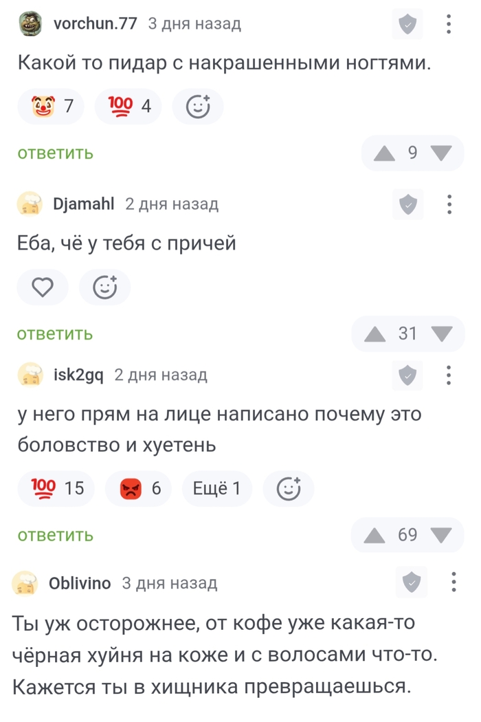 Ответ на пост ответа на пост. Действительно, дело не в расизме, а в отсутствии основ культуры и воспитания. У меня есть отличный маркер таких людей - моя внешность, которая не дает им покоя.
