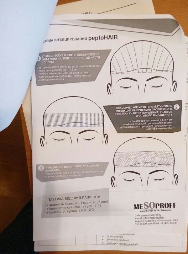 Мезотерапия подразумевает введение в кожу головы коктейлей из витаминов, аминокислот и факторов роста для питания фолликулов. Среднее количество процедур — 6–10 процедур, проводимых еженедельно или раз в 2 недели, с поддерживающими курсами 1–2 раза в год. Необходимо ответственно подойти к выбору препарата, всегда уточняя у специалистов, какой именно состав используется, поскольку многие сыворотки имеют далеко не оптимальные формулы. Например, клиники могут предлагать коктейли, предназначенные для кожи лица, что не делает их идеальным вариантом для лечения алопеции; в частности, NCTF 135 ориентирован на борьбу с первыми признаками увядания кожи и коррекцию эстетических дефектов, но иногда применяется и для облысения.
