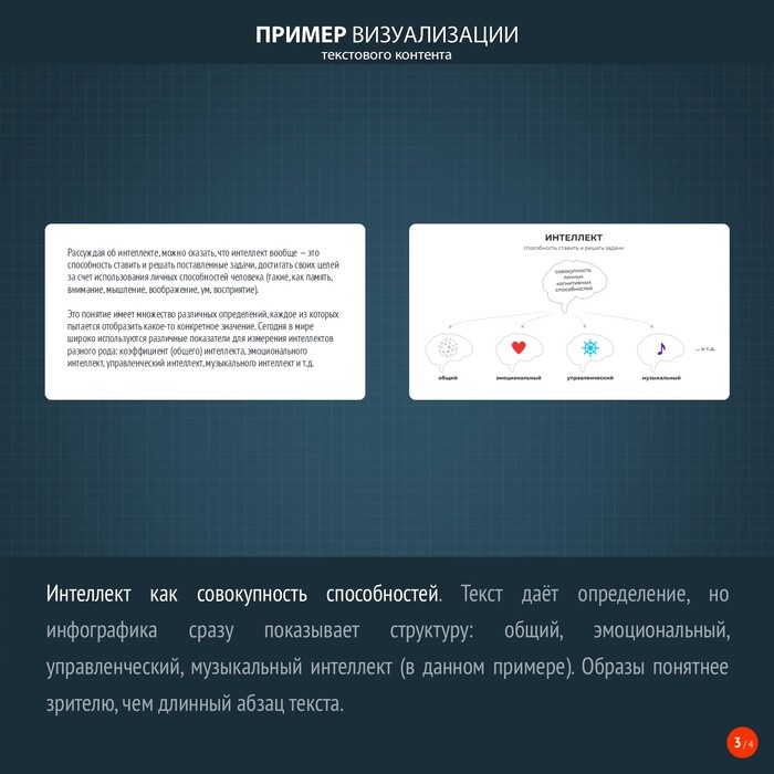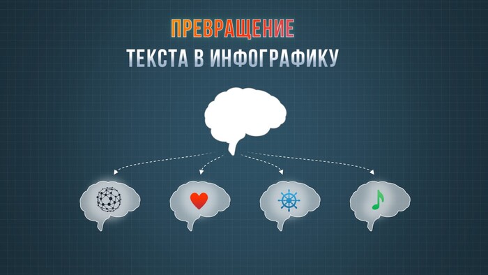 Визуализация отдельных тезисов и фактов является первым шагом уже непосредственно в отрисовке инфографики. Основные инструменты — графические образы, репрезентирующие факты на инфографической схеме с акцентом на аллегории и метафоры для передачи тех или иных смысловых нюансов. Аллегория выражает абстрактные идеи через конкретные символы, а метафора опирается на переносное значение, основанное на общих признаках или культурных стереотипах. Например, при визуализации определения интеллекта как «способности решать задачи с опорой на когнитивные функции (память, внимание, мышление)» центральным образом может стать мозг (или его условное обозначение в виде иконки) — универсальная метафора разума. Такой приём обеспечивает мгновенную ассоциацию и экономит место на слайде. Если подходящий образ подобрать сложно — следует оставить текст, сокращённый до тезисов (для лаконичности).