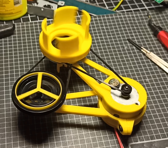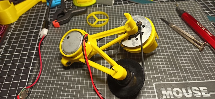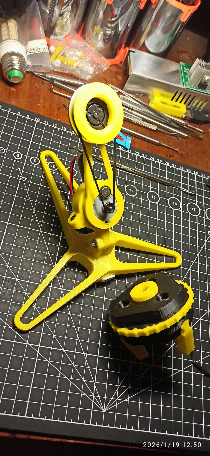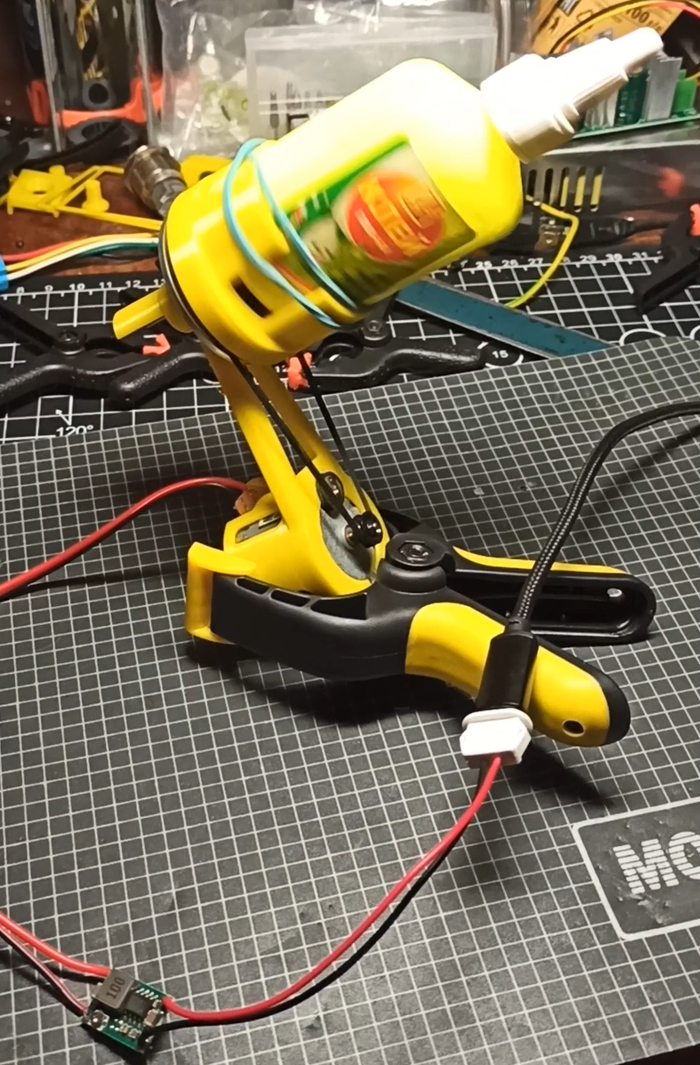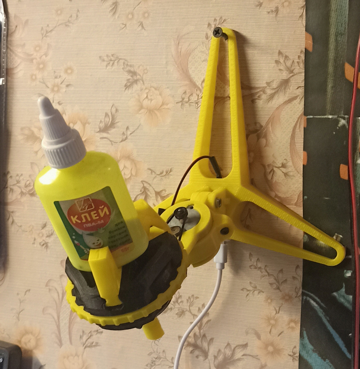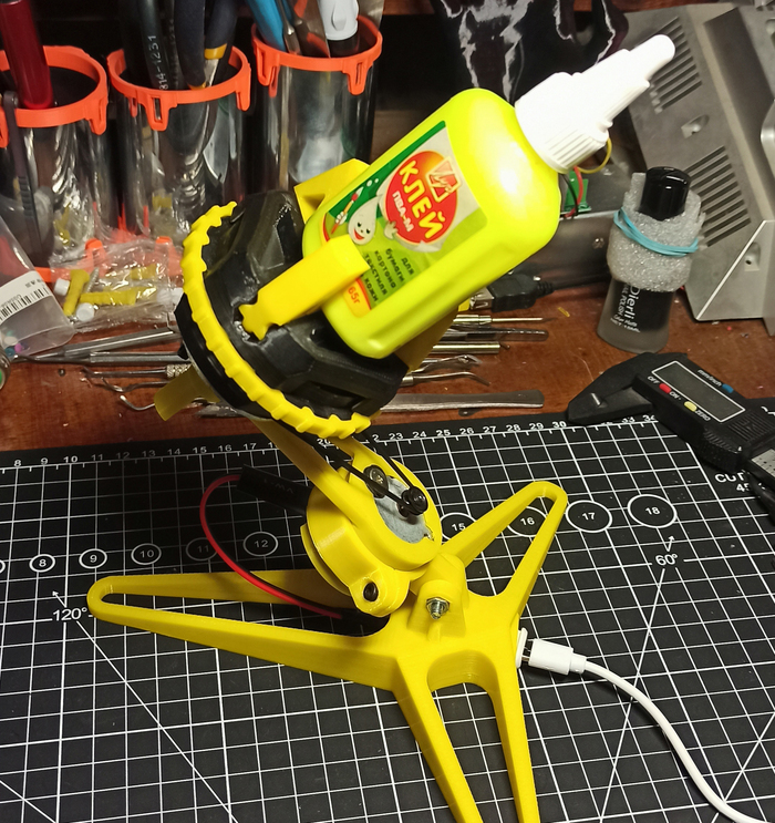 Покупать свежий лень, да и всё равно он снова засохнет... Долью водички и размешаю. Модифицирую свой "столик". Моделю и печатаю держалку бутылки. И приклеиваю к шкиву.