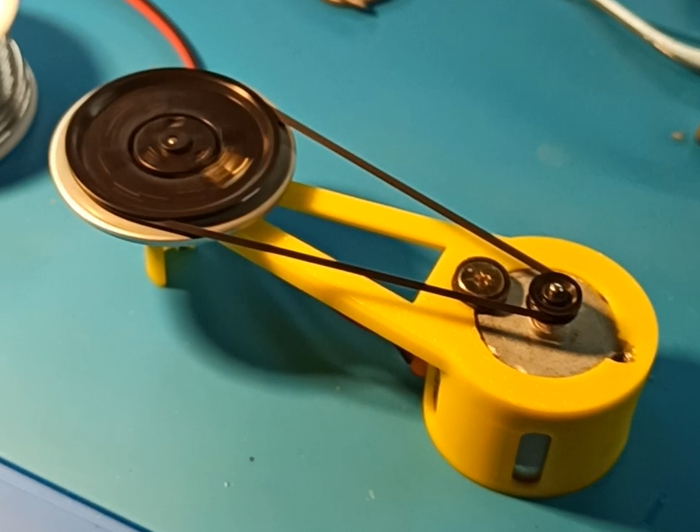 Разбираю, выкидываю всё лишнее, оставляю моторчик, шкив и пассик. От 5В моторчик работает. Живой. Регулятором напряжения Liludin LM2596, обороты регулируются, прекрасно. Продолжим.