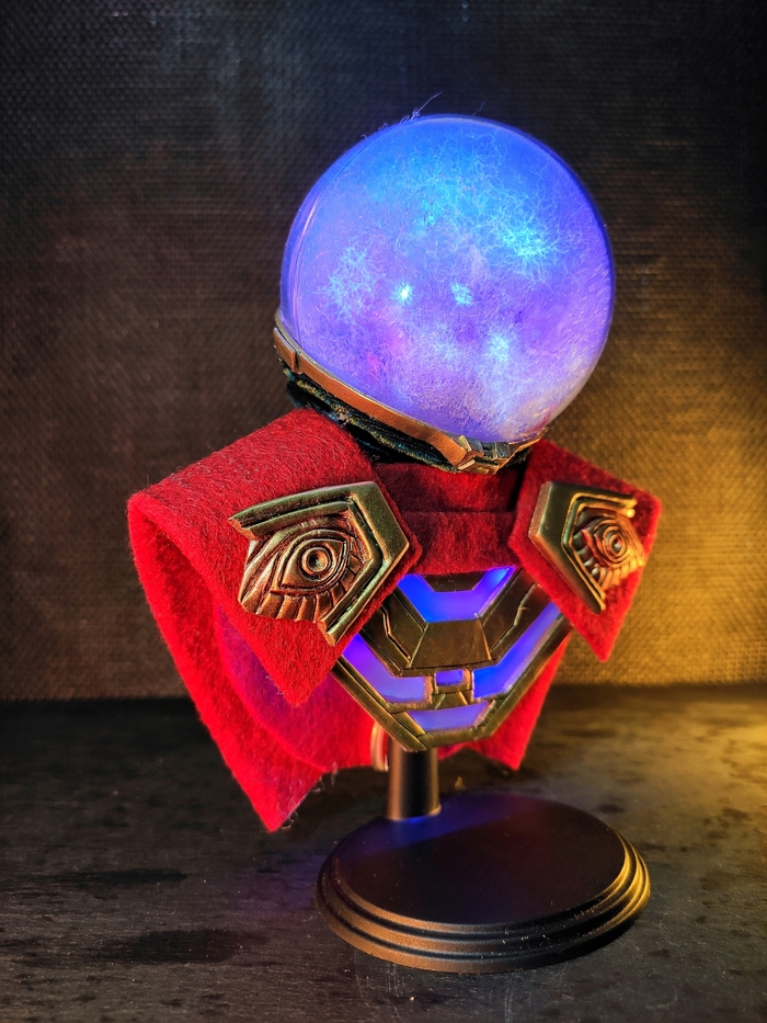 Из самозатвердевающей глины сделала бюст, приклеила его на подставку. При помощи горячего клея зафиксировала на голове светодиодную гирлянду.